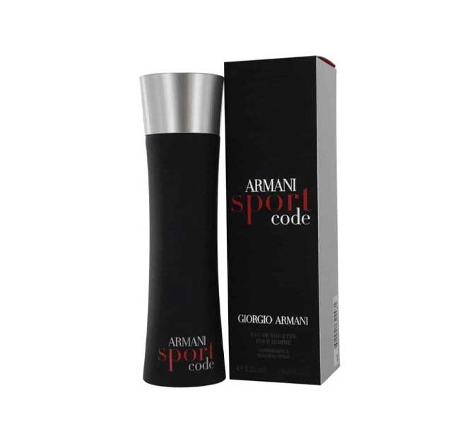 روی بطری سیاه رنگ این عطر نام Armani Code Sport و نشان تجاری آرمانی دیده میشود